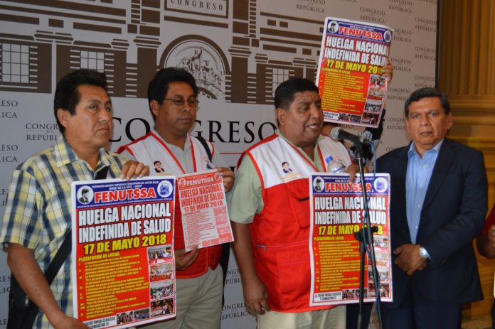 En conferencia de prensa realizada en el Congreso, representantes de la Federación Nacional Unificada de Trabajadores del Sector Salud, acompañados del congresista Hernando Cevallos, anunciaron el inicio de una huelga nacional indefinida este jueves 17 de mayo.