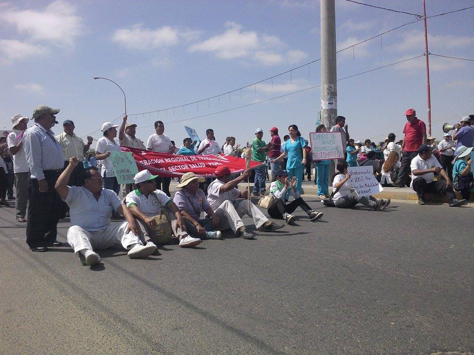Tras bloquear por 10 minutos el puente Sanchez Cerro, los manifestantes llegaron a la sede del Gobierno Regional para exigir al gobernador Reynaldo Hilbck, el reconocimiento de los intereses que por ley les corresponde de los impagos de beneficios laborales que contempla el Decreto Supremo 037.