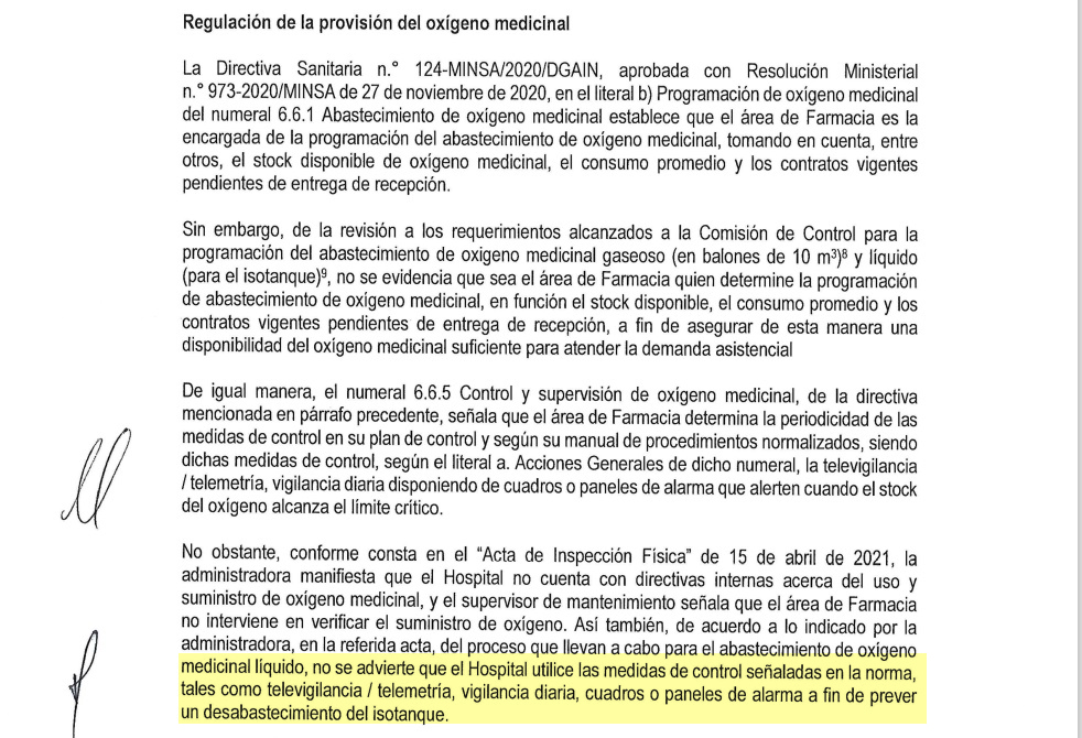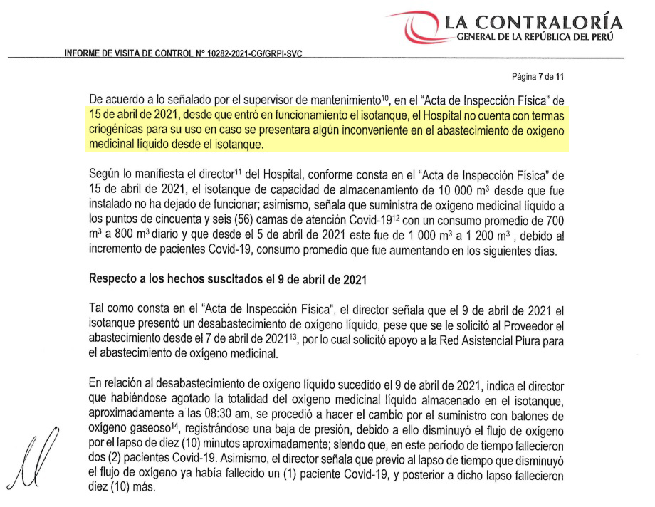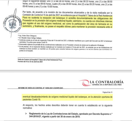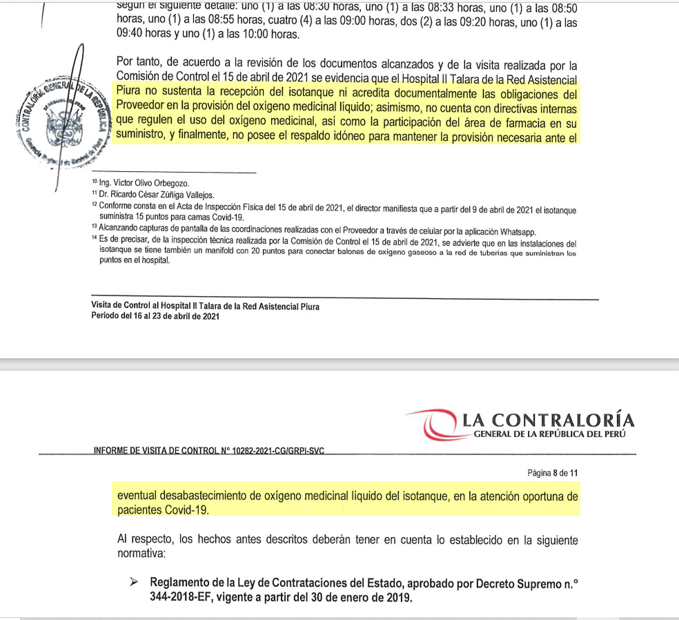 El informe que ha sido notificado al médico Ricardo Zúñiga, director del referido hospital, con fecha 27 de abril de 2021 para la pronta adopción de acciones preventivas y correctivas. Cabe resaltar que la auditoría de la Contraloría se realizó antes de la instalación de dos plantas de oxígeno, enviadas por el Gobierno Central a través del Seguro Social de Salud, luego del reclamo que hicieron los congresistas y la ciudadanía de Piura.