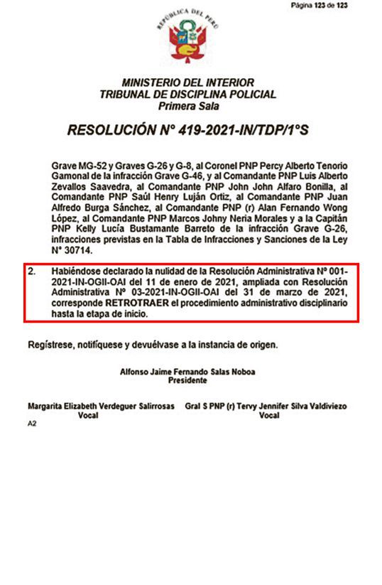 En el documento, de 123 páginas, se señala que el procedimiento administrativo inicial obvió una serie de procedimientos indispensables, por lo que anuló la primera resolución administrativa, que hallaba responsabilidades en los once oficiales, así como la decisión de Inspectoría, de absolverlos. Es decir, todo vuelve a fojas cero.