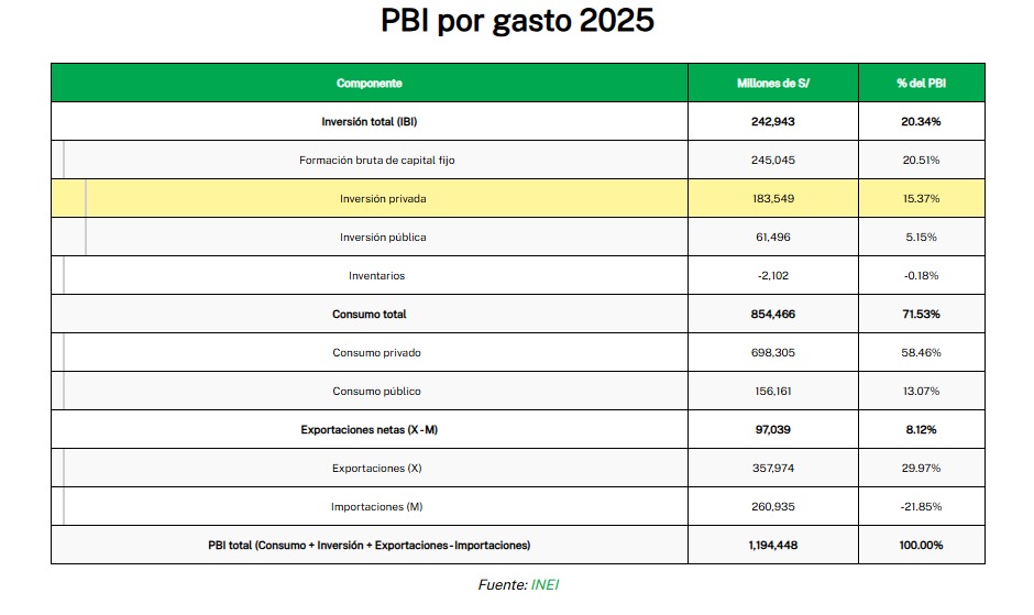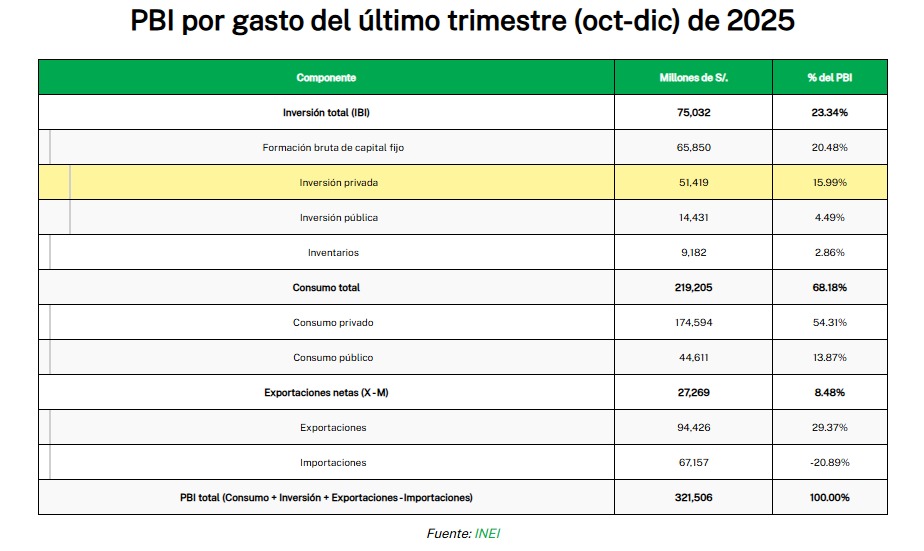 La inversión privada representó el 72% del crecimiento del PBI en el cuarto trimestre de 2025 respecto del mismo trimestre de 2024. El aumento de PBI entre esos periodos es de S/.4,795 millones. De ellos, S/.3,471 millones se debieron a la inversión privada.