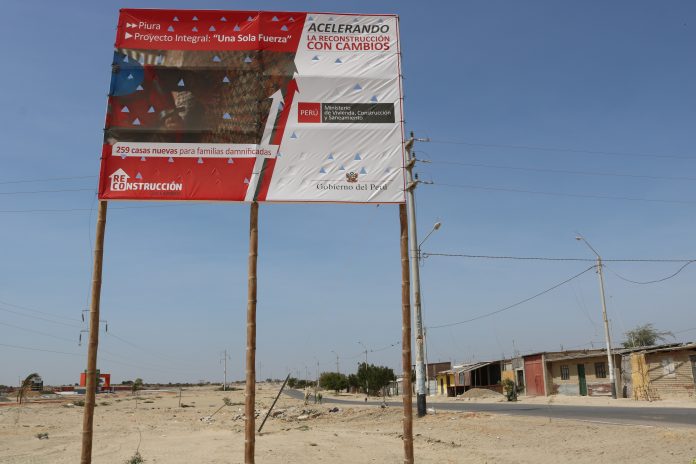Según el ofrecimiento del ministro Carlos Bruce, allí se tenía previsto iniciar la obra de construcción de casas definitivas en octubre pasado, y entregar las primeras 200 viviendas (de un total de 600) en noviembre. Sin embargo, el mencionado cartel anuncia solo 259 casas para las familias damnificadas.