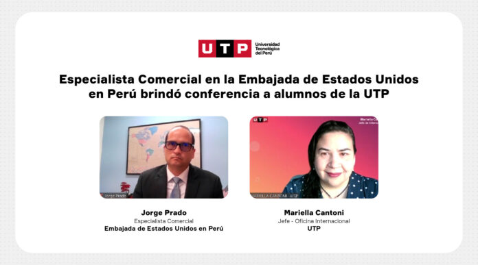 La Universidad Tecnológica del Perú (UTP) organizó la “Conferencia sobre relaciones comerciales bilaterales, Perú – Estados Unidos”. En el evento virtual participaron Mariella Cantoni, jefe de la Oficina Internacional de la UTP; y Jorge Prado, Especialista Comercial en la Embajada de Estados Unidos en Perú.
