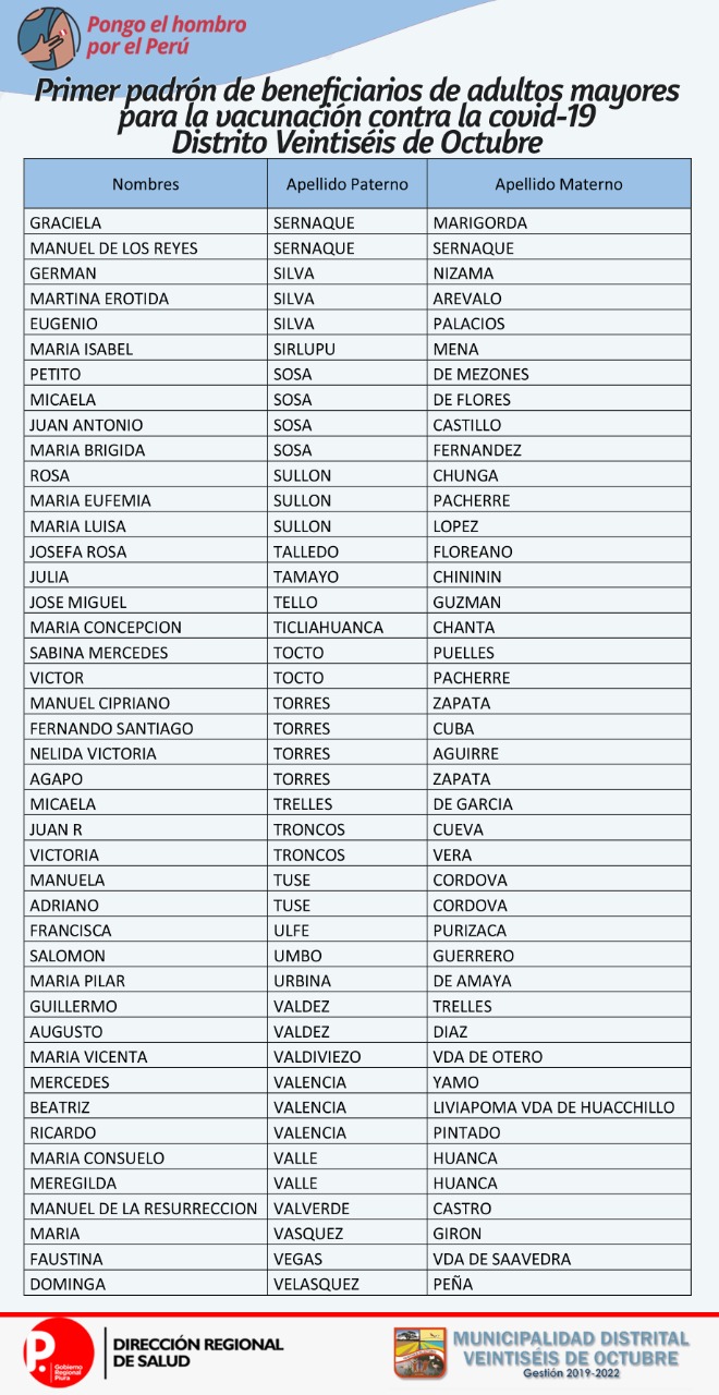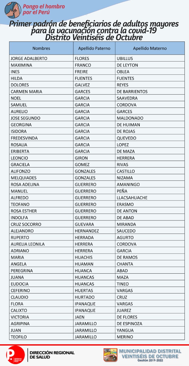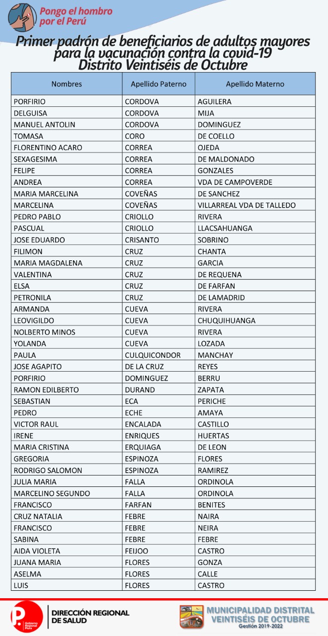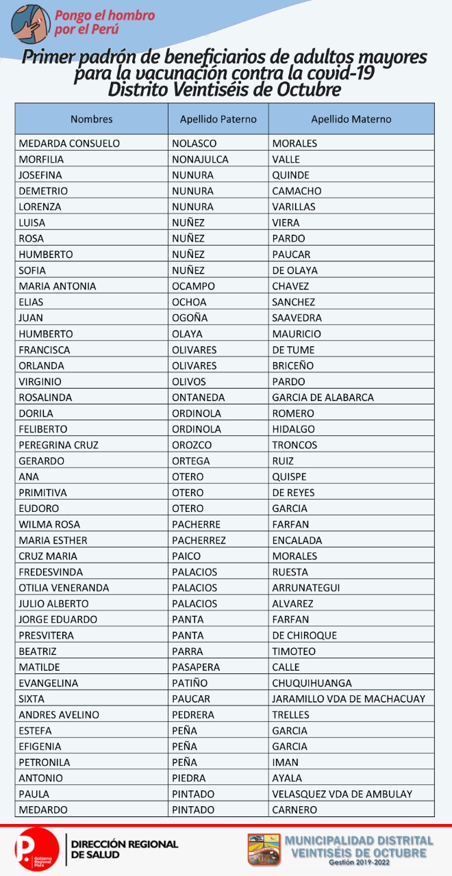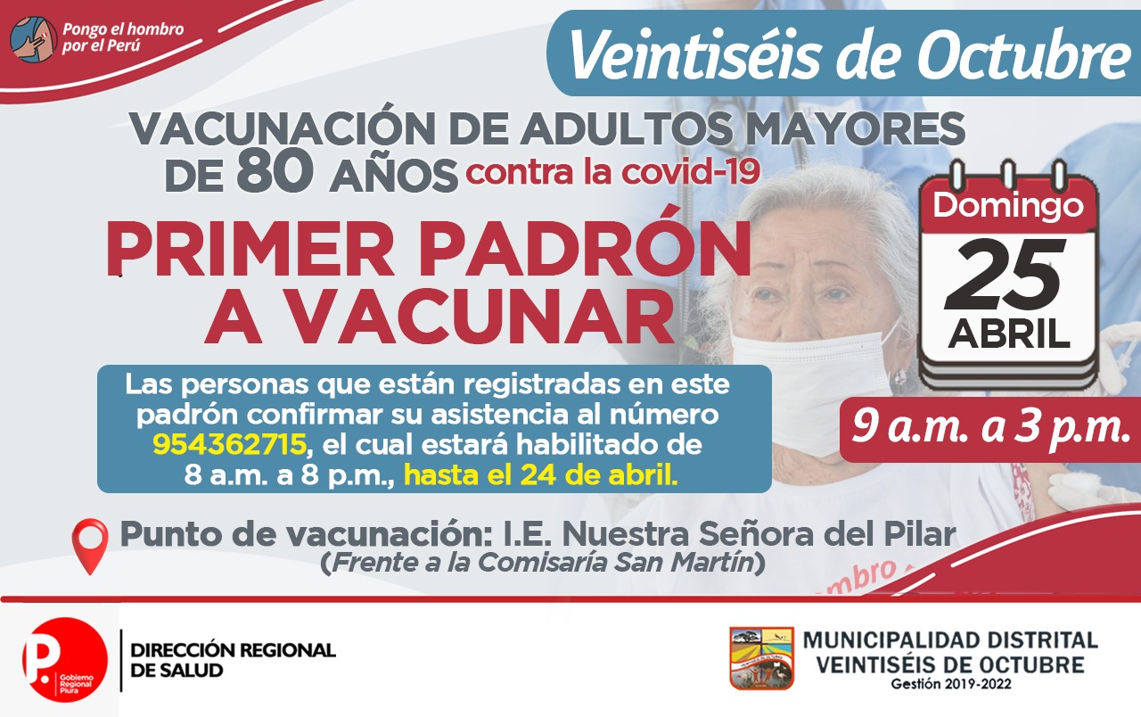 OJO: La Diresa Piura y la Municipalidad de Veintiséis de octubre publicaron el primer padrón de adultos mayores que serán vacunados este domingo 25 de abril, para lo cual deberán llamar al 954362715  para confirmar su cita.