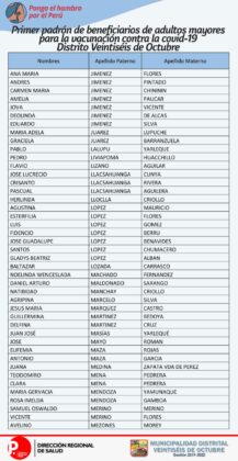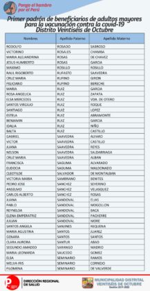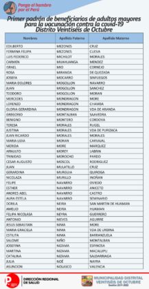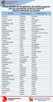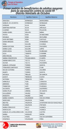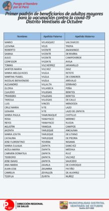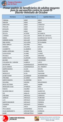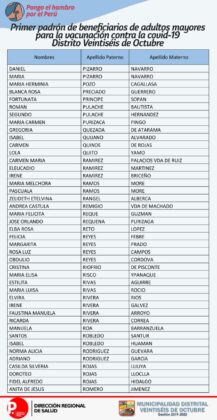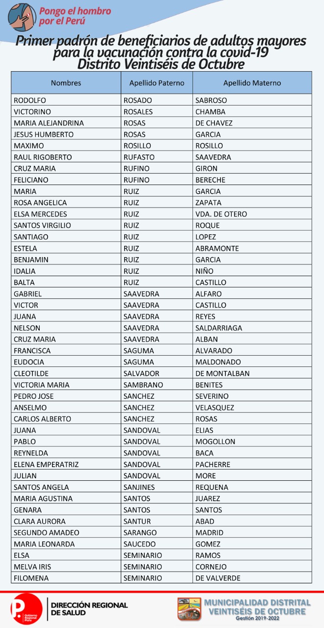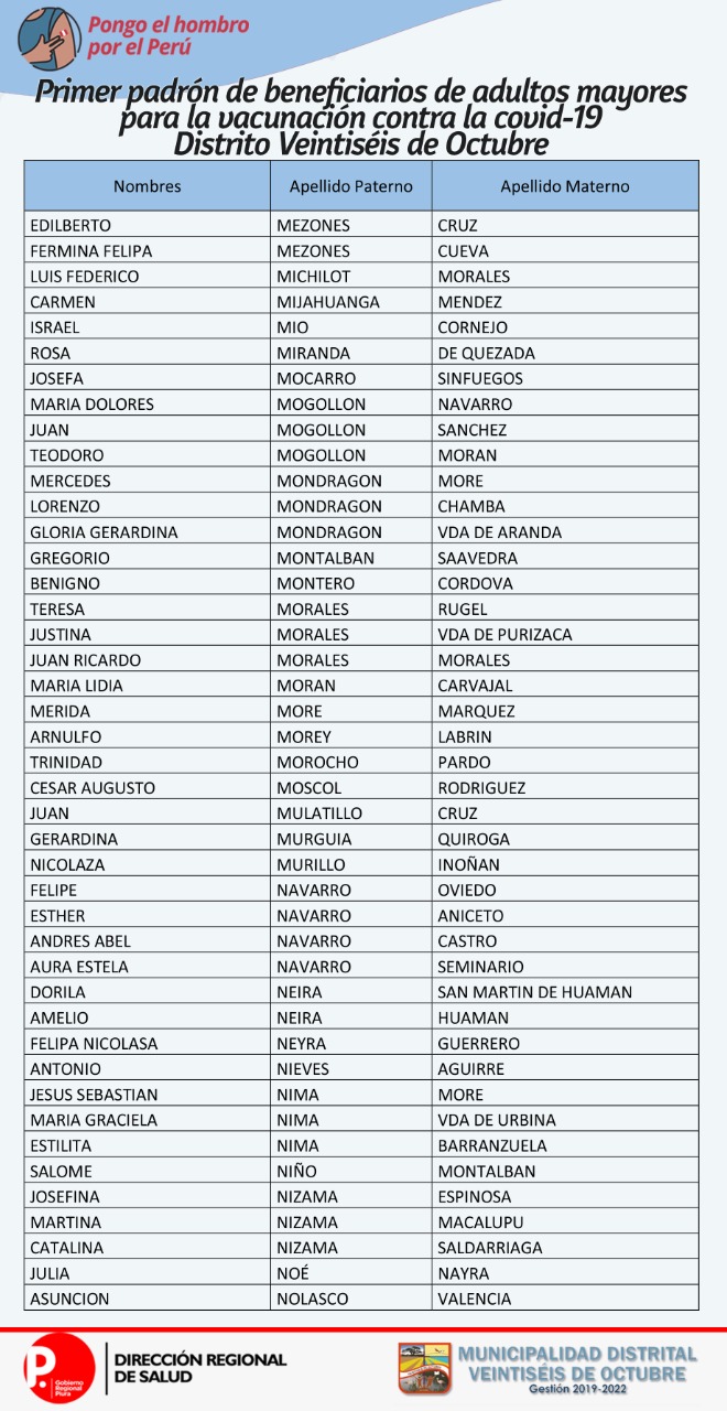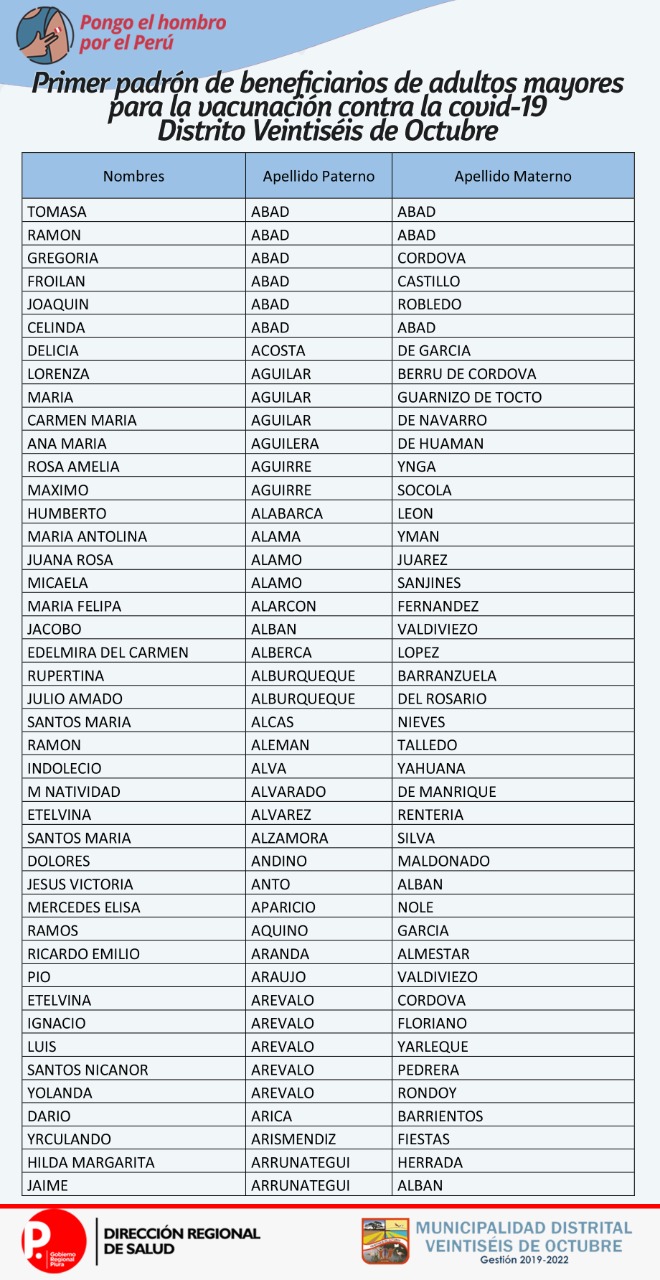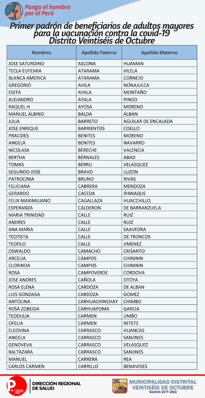 OJO: La Diresa Piura y la Municipalidad de Veintiséis de octubre publicaron el primer padrón de adultos mayores que serán vacunados este domingo 25 de abril, para lo cual deberán llamar al 954362715  para confirmar su cita.