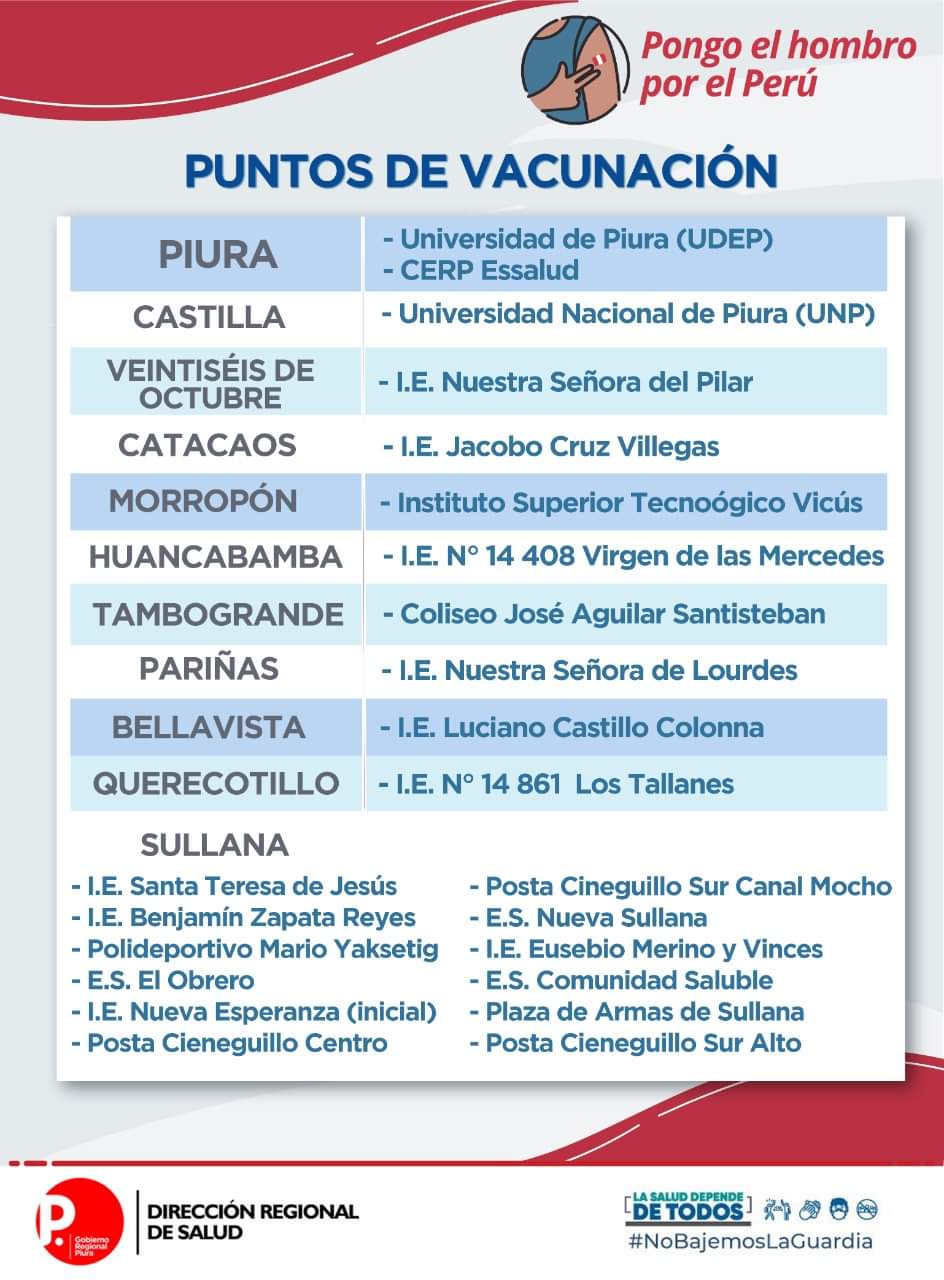 En la ciudad de Sullana se han acondicionado otros 12 puntos de vacunación ubicados en los siguientes colegios y centros de salud: I.E Santa Teresa de Jesús, I.E Benjamín Zapata Reyes, Polideportivo Mario Yakzetig, E.S El Obrero, I.E Nueva Esperanza (inicial), Posta Cieneguillo Centro, Posta Cieneguillo Sur Canal Mocho, E.S Nueva Sullana, I.E Eusebio Merino y Vinces, E.S Comunidad Saludable, Plaza de Armas de Sullana, Posta Cieneguillo Sur Alto.