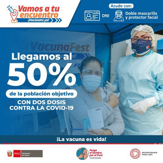 Más protegidos a nivel nacional. El Perú alcanzó el 50% de su población objetivo inmunizada con dos dosis, con lo que se evitarán los casos graves y posibles defunciones a causa de la COVID-19. Así lo dio a conocer el Ministerio de Salud (Minsa) por medio de sus redes sociales, en las que siguió instando a los ciudadanos a que acudan por su primera y segunda dosis contra la enfermedad.