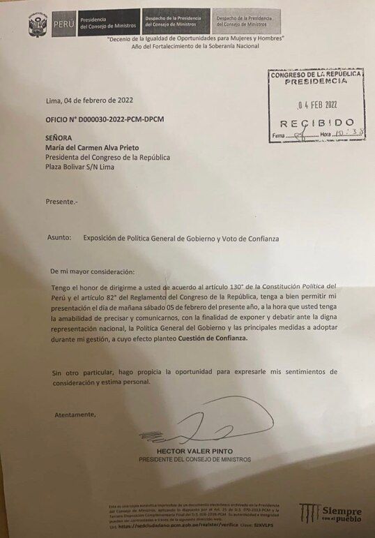 “Tengo el honor de dirigirme a usted de acuerdo al artículo 130 de la Constitución Política del Perú y el artículo 82° del Reglamento del Congreso de la República, tenga a bien permitir mi presentación el día sábado 5 de febrero del presente año, a la hora que usted tenga la amabilidad de precisar y comunicarnos, con la finalidad de exponer y debatir ante la digna representación nacional, la política general del Gobierno y las principales medidas a adoptar durante mi gestión, a cuyo efecto planteo Cuestión de Confianza”, se lee en el documento.