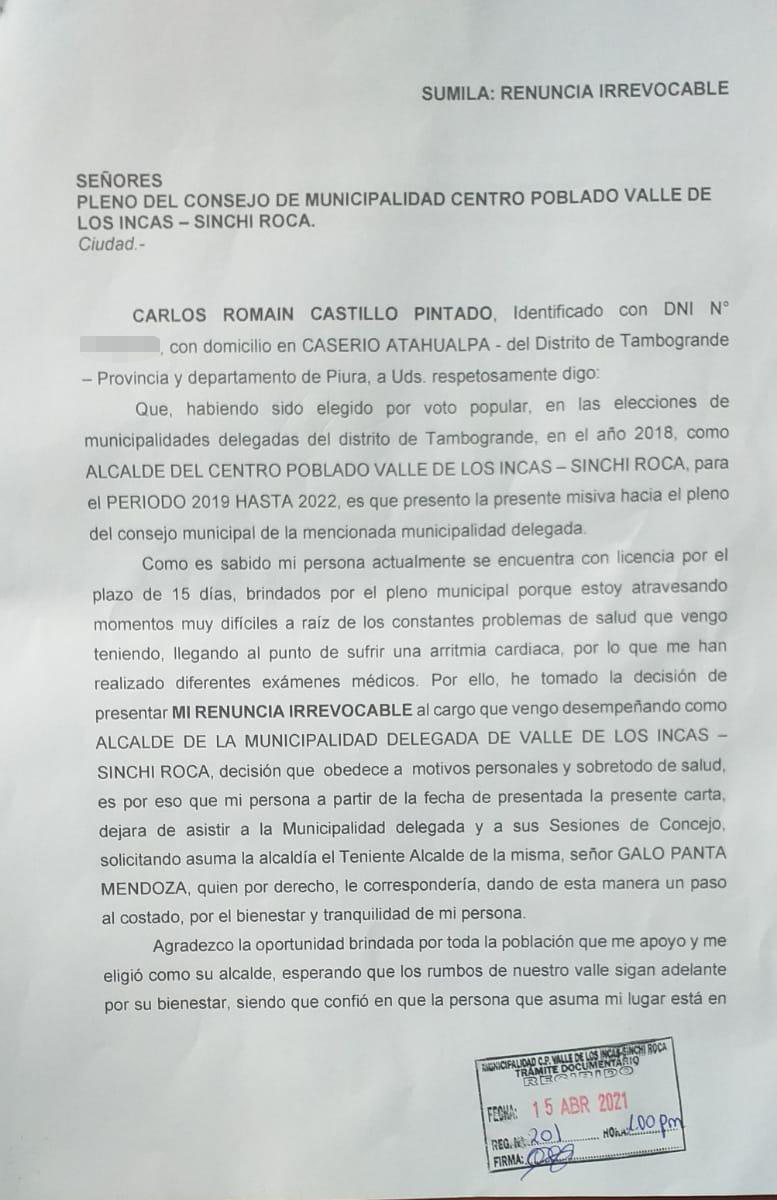 Carlos Romain Castillo Pintado presentó su renuncia a la alcaldía del centro poblado Valle de Los Incas (Tambogrande) luego de ser denunciado por tercera vez por tentativa de feminicidio. Mercy Llacsahuanga Ramírez, pareja del exalcalde Castillo, hizo la denuncia este 14 de abril y señaló que la habría amenazado de muerte con un cuchillo.