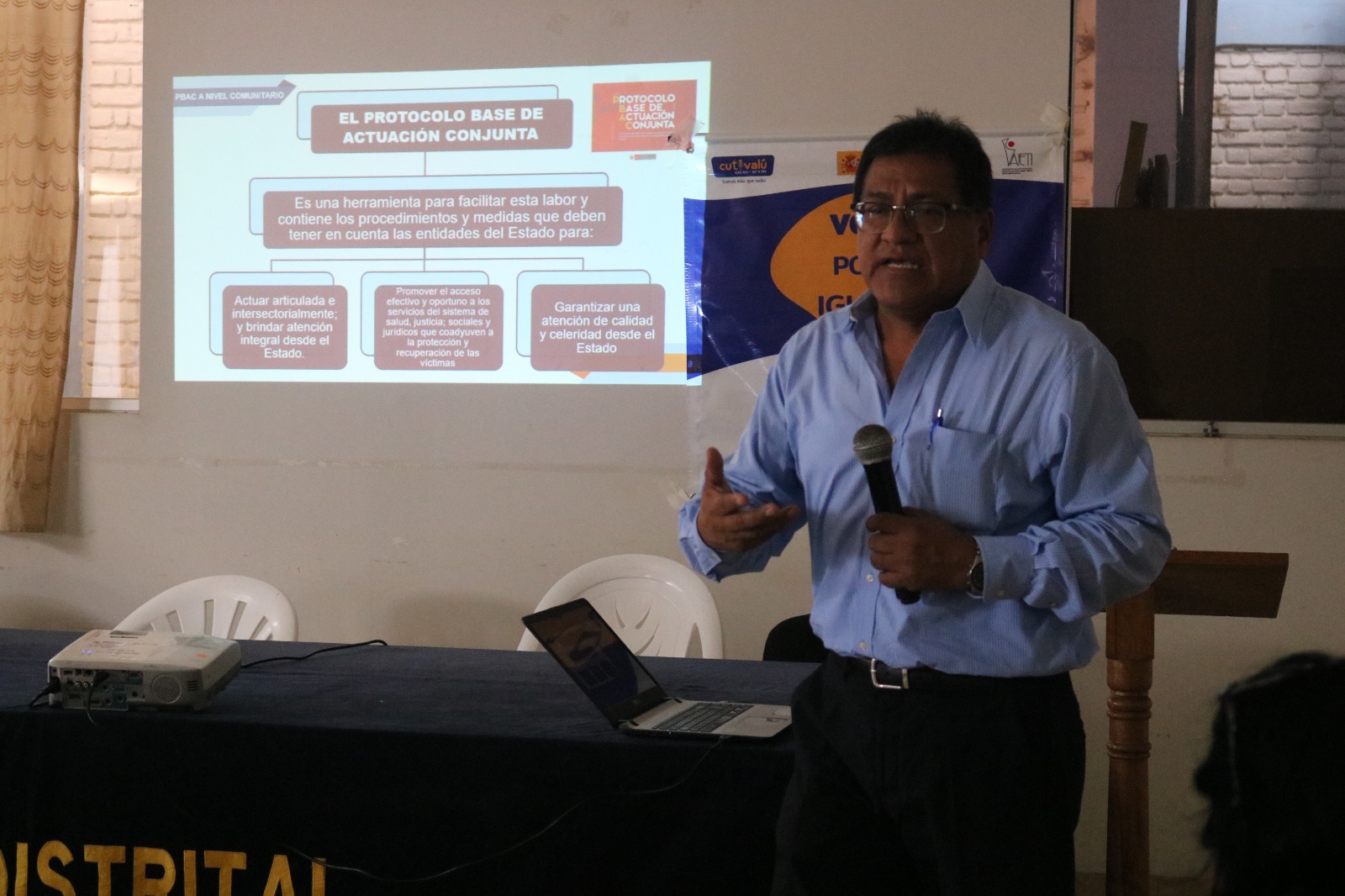 «El PBAC es un instrumento que permitirá que las autoridades de los asentamientos humanos trabajen articuladamente con la instancia distrital y se de celeridad en la prevención y atención de la violencia de género en zonas donde no llega el Estado», señaló el Dr. José Luis Velázquez Quesquén, coordinador de la Unidad de Atención a Víctimas y Testigos del Ministerio Público de Piura.