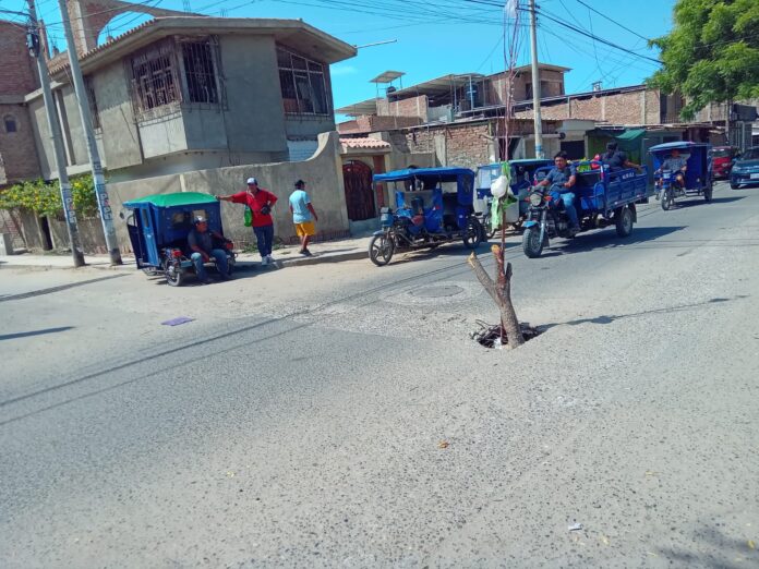En la intersección de la calle Los Tallanes con la cuadra 11 de la avenida Grau, en Castilla, moradores y mototaxistas han colocado un improvisado “yunce” en medio de la pista para advertir sobre un peligroso forado que permanece sin ser atendido desde hace meses.