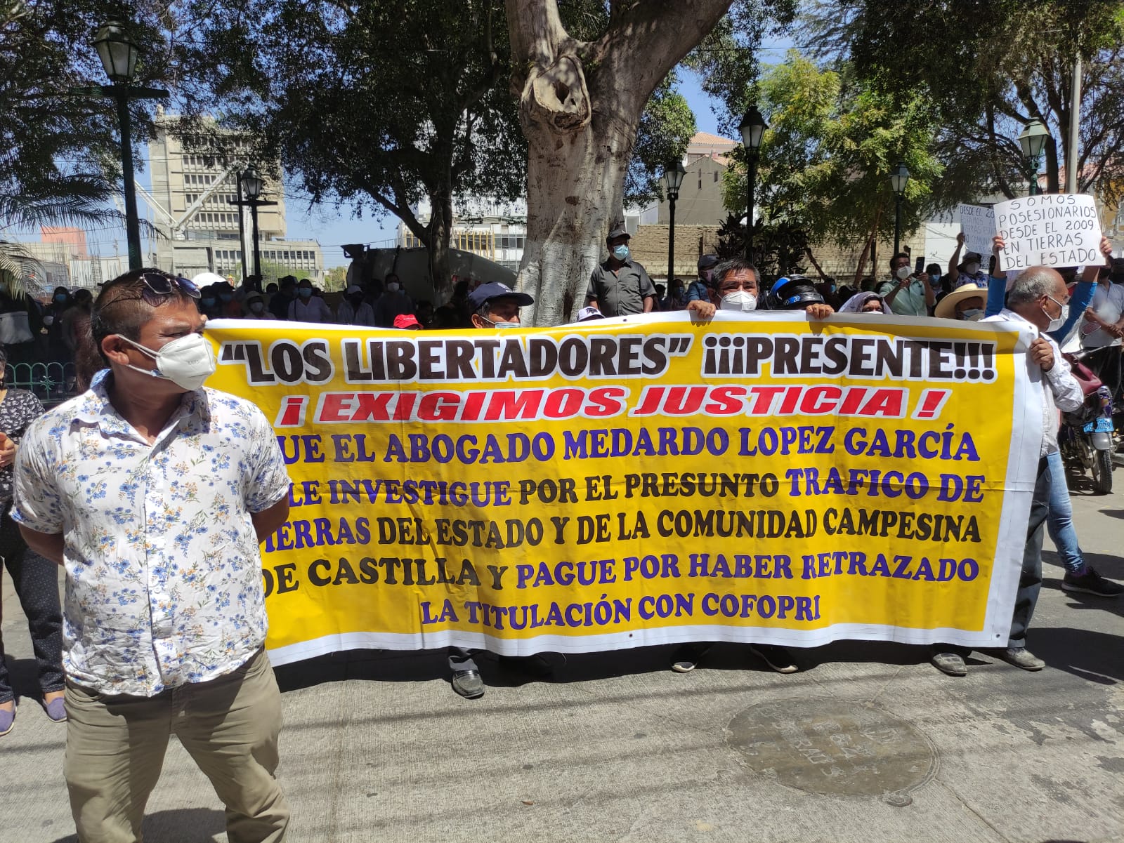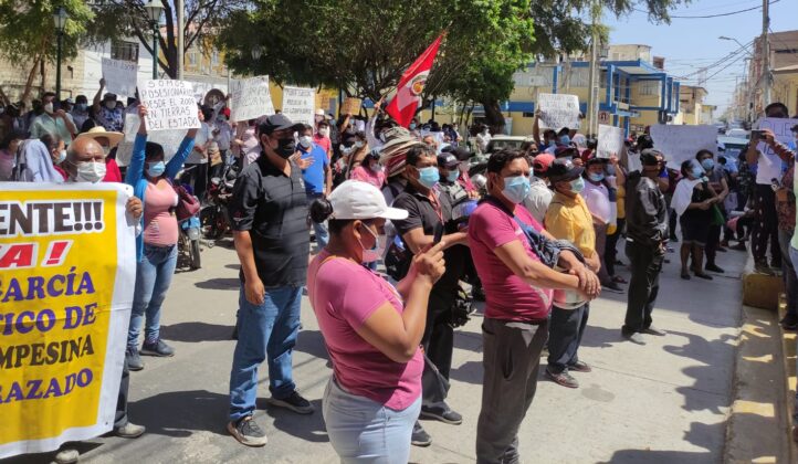 Cientos de pobladores de los asentamientos Villa Chulucanas, Villa La Paz y Los Libertadores del distrito de Castilla realizaron una protesta frente a la Corte Superior de Justicia de Piura, para exigir que el Poder Judicial resuelva el proceso judicial que tienen con la cooperativa Los Rosales, representada por Medardo López García.