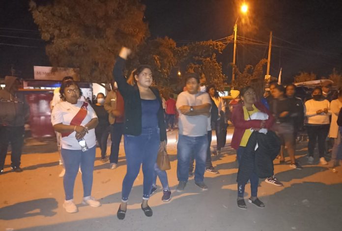 Un grupo de personeros del candidato a la alcaldía de Veintiséis de Octubre, Percy Fiestas, protestó en los exteriores del colegio José Olaya Balandra, denunciando que la Oficina Nacional de Procesos Electorales (ONPE) no les quería entregar las actas.