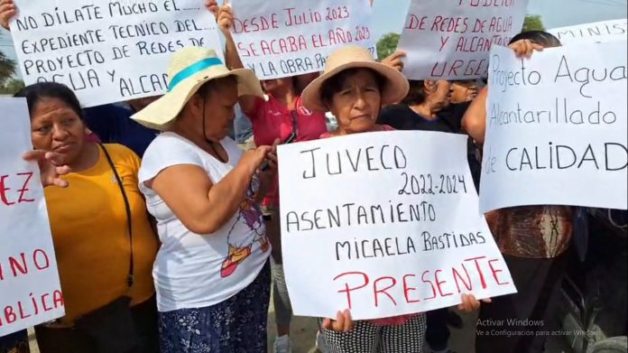 Este jueves 5 de octubre, decenas de vecinos del asentamiento humano Micaela Bastidas se manifestaron frente a la Municipalidad Distrital de Veintiséis de Octubre para exigir la licitación de una obra de agua y alcantarillado que beneficiará a los cuatro sectores de la zona.