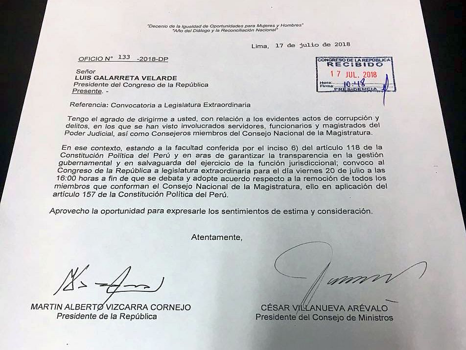 “Convoco al Congreso de la República a legislatura extraordinaria para el día viernes 20 de julio a las 16:00 horas a fin de que se debata y adopte acuerdo respecto a la remoción de todos los miembros que conforman el Consejo Nacional de la Magistratura, ello en aplicación del artículo 157 de la Constitución Política del Perú”, se lee en el oficio.