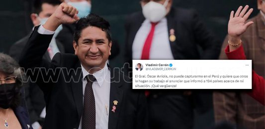 El prófugo Vladimir Cerrón, condenado a tres años y medio de prisión efectiva por el caso “Aeródromo Wanka”, volvió a pronunciarse desde la clandestinidad. Cerrón Rojas atacó al jefe de la Dirección de Investigación Criminal de la Policía, Óscar Arriola Delgado, tras la alerta azul emitida por la Interpol para ubicarlo en 194 países. “Se … Sigue leyendo Vladimir Cerrón se burla de la justicia en redes sociales: “No pueden capturarme en el Perú”